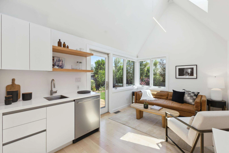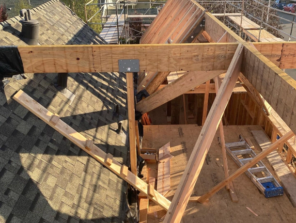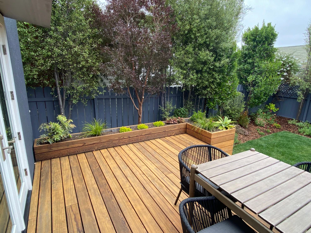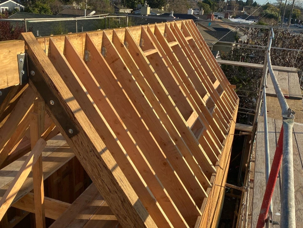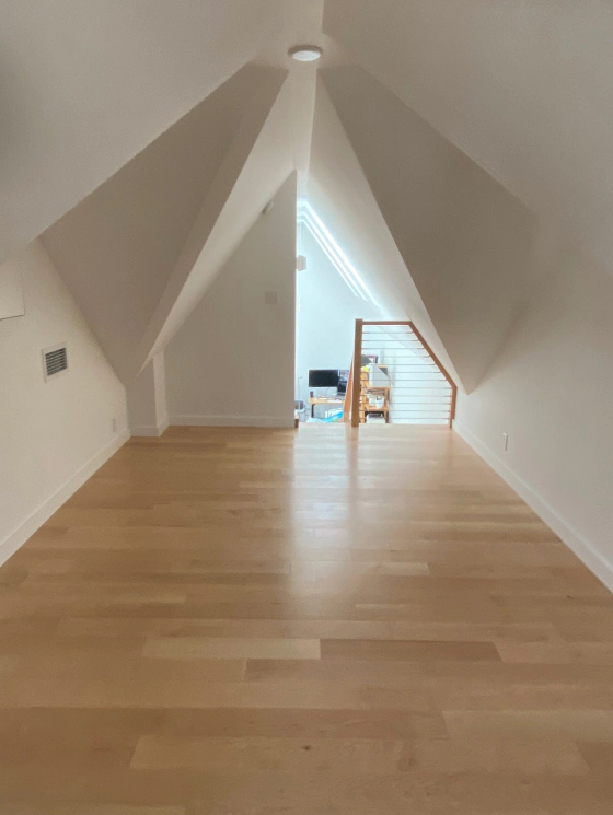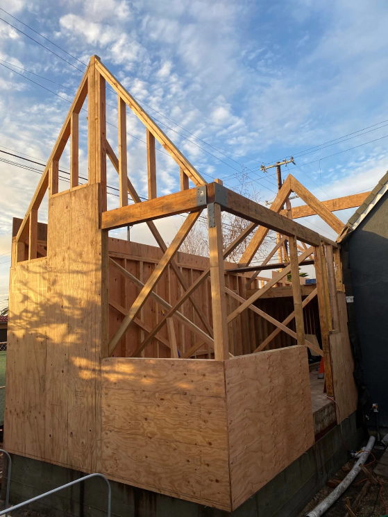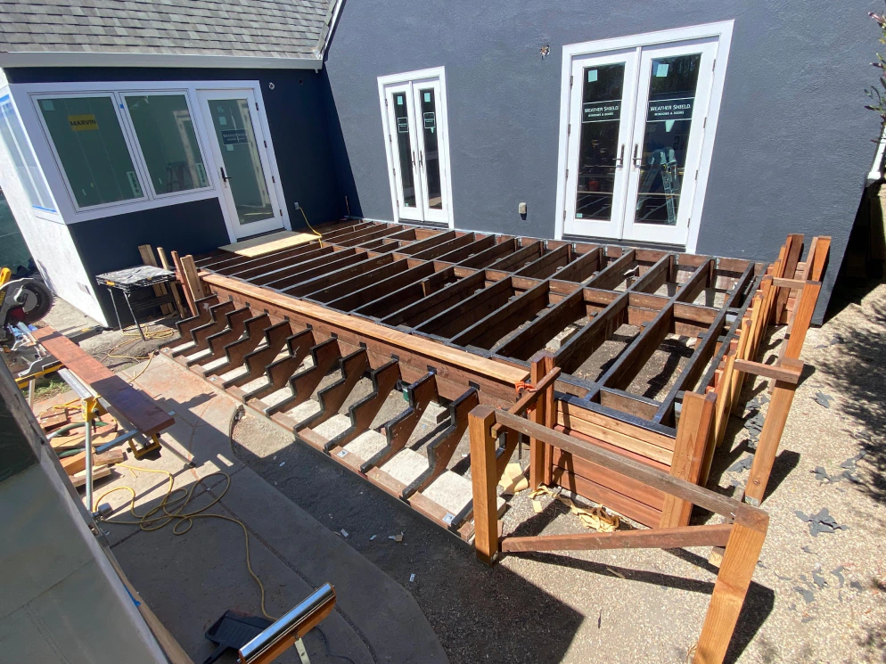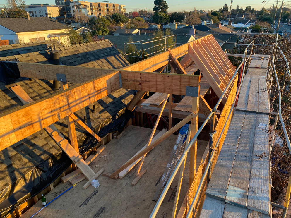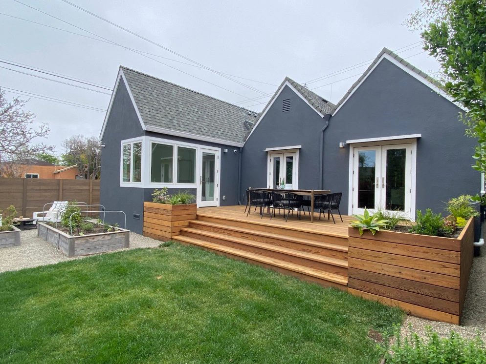 This project’s main goal was to create an office workspace for a growing family that was quickly running out of room. This 485 sq ft addition featured a garage with “storage”: above well suited for sleeping and lounging, as well as the main office space and a full bathroom. One main challenge was doing construction around a family with very high demands around dust control. We ran HEPA filtration systems throughout the project, creating negative and positive air pressure to control air movement carefully. Another main challenge was doing a cathedral ceiling with some very unique framing details and custom metal fabrication required to satisfy the seismic demands of the 14’ high cathedral ceiling. Another very fun project was the new back deck with custom redwood planter boxes extending up above the deck.